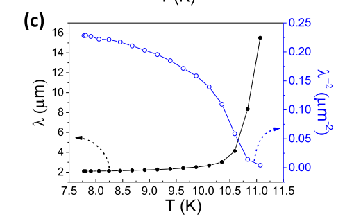 图3(c) 磁穿透深度 λ 和从反射型测量中提取的超流体密度 ns / λ-2结果。弯曲的箭头表示每个对应的 Y 轴位置数据集
