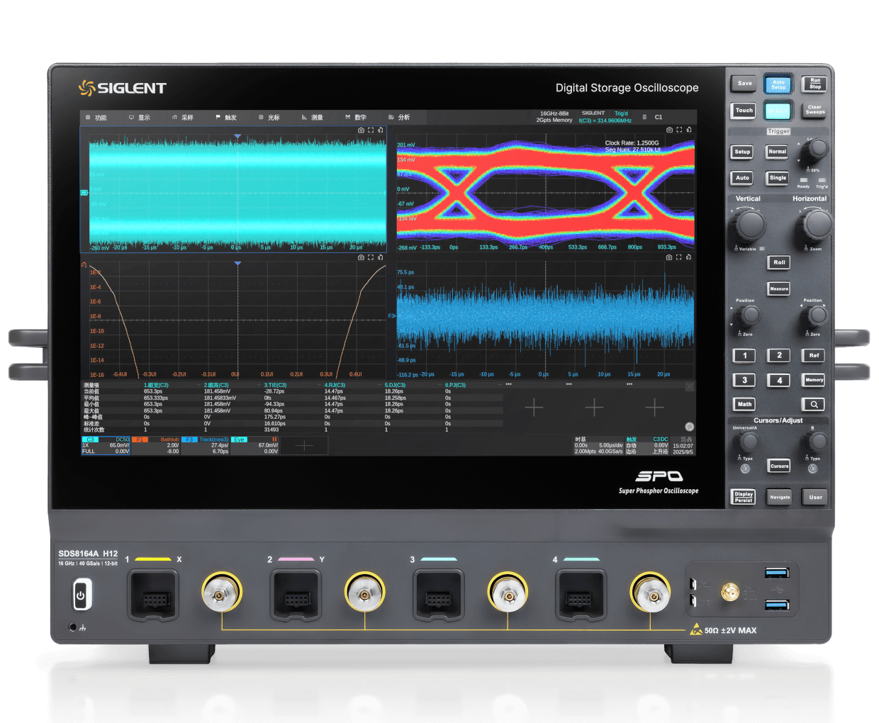 实时采样率高达 40 GSa/s(12-bit 型号)和 50 GSa/s (8-bit 型号),所有通道同时达到